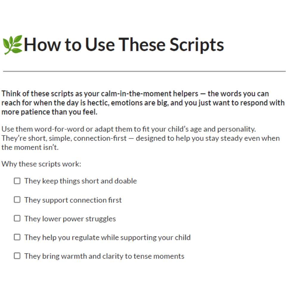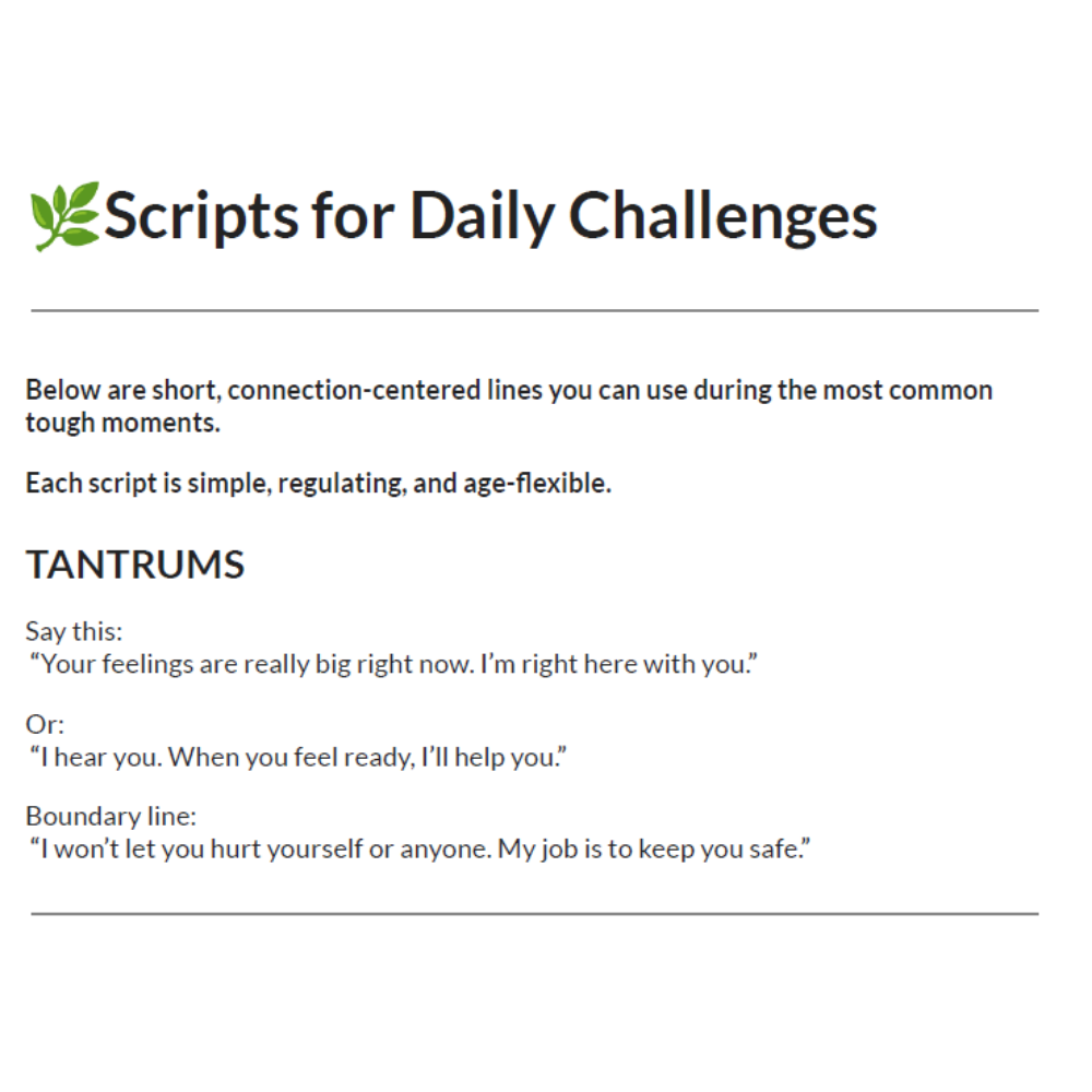 The What-to-Say Parenting Scripts Bundle gives you exact, calm, connection-first phrases for tantrums, tears, sibling fights, morning chaos, bedtime battles, and more.